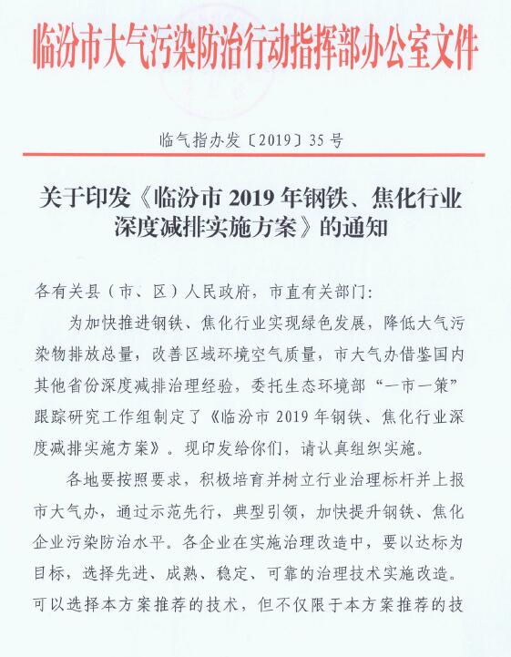 日前,山西臨汾印發《臨汾市2019年鋼鐵、焦化行業深度減排實施方案》。方案要求: