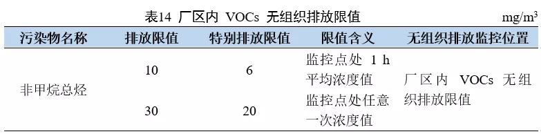 本標(biāo)準(zhǔn)規(guī)定了 VOCs物料儲(chǔ)存無組織排放控制要求、VOCs物料轉(zhuǎn)移和輸送無組織排放控制要求、工藝過程 VOCs無組織排放控制要求、設(shè)備與管線組件 VOCs 泄漏控制要求、敞開液面 VOCs無組織排放控制要求,以及VOCs無組織排放廢氣收集處理系統(tǒng)要求、企業(yè)廠區(qū)內(nèi)及周邊污染監(jiān)控要求。標(biāo)準(zhǔn)適用于涉及 VOCs無組織排放的現(xiàn)有企業(yè)或生產(chǎn)設(shè)施的 VOCs無組織排放管理,以及涉及VOCs無組織排放的建設(shè)項(xiàng)目的環(huán)境影響評(píng)價(jià)、環(huán)境保護(hù)設(shè)施設(shè)計(jì)、竣工環(huán)境保護(hù)驗(yàn)收、排污許可證核發(fā)及其投產(chǎn)后的 VOCs無組織排放管理。標(biāo)準(zhǔn)主要對(duì)無組織管控提出要求,在限值方面,強(qiáng)調(diào)了廠區(qū)內(nèi) VOCs 無組織排放的限值要求,見下表。該標(biāo)準(zhǔn)已于 2020 年 7 月 1 日起全面實(shí)施。