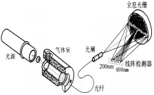 光源發出的紫外光通過光纖傳輸到測量室,測量室樣氣在特定波段吸收紫外光譜能量,被吸收后的光束通過光纖傳輸到光譜儀,在光譜儀內部經過光柵分光,由二極管陣列檢測器將分光后的光信號轉換為電信號,獲得氣體的連續吸收光譜信息,最后根據特定算法計算待測氣體濃度。其結構示意圖如下: